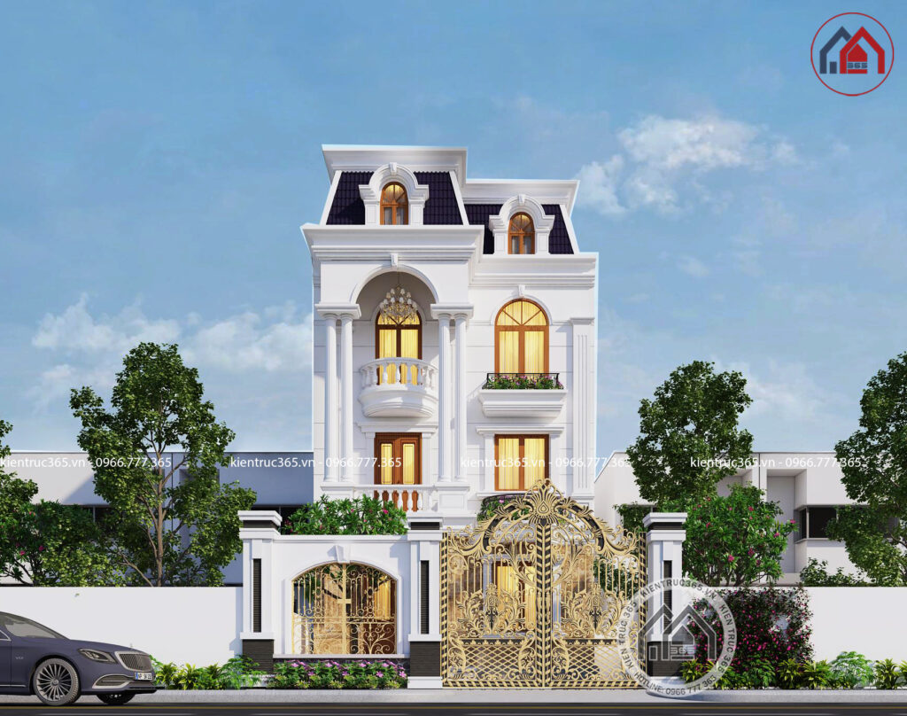 .Biệt thự lâu đài 3 tầng cổ điển được xây dựng trên một khu đất khang trang rộng lớn, nơi tâm điểm của mọi ánh nhìn để có thể khoe hết vẻ đẹp cầu kì mĩ miều của toàn bộ ngôi nhà.  Toàn bộ lâu đài mang một màu trắng tinh tế làm hài lòng bất kì ai khó tính nhất, hệ thống tiền sảnh được đậm tô màu vàng quý tộc, lâu đài còn  được làm đẹp bởi hệ thống mái mansard, mái vòm nhấp nhô mang lại linh hồn cho toàn bộ lâu đài. Lâu đài còn ấn tượng hơn bởi hệ thống cổng kiên cố, uy nghi, nửa mở nhằm có thể khoe nhà đẹp với bất cứ ai. Khi nhìn vào lâu đài dinh thự, chắc hẳn ai cũng muốn có cho mình một biệt thự lâu đài pháp như vậy.